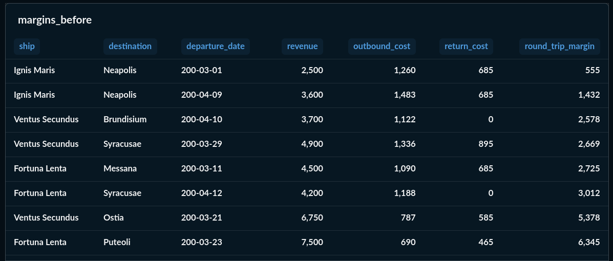 Then a new voyage_costs table with six columns breaking out every voyage's costs: