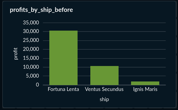The Ignis Maris went from the least profitable ship in the fleet to the most profitable — by about twice the Fortuna Lenta's total. Not because we abandoned Phoenix cargo, but because we learned how to use it. Phoenix pays for the voyage. Pepper pays for the profit.